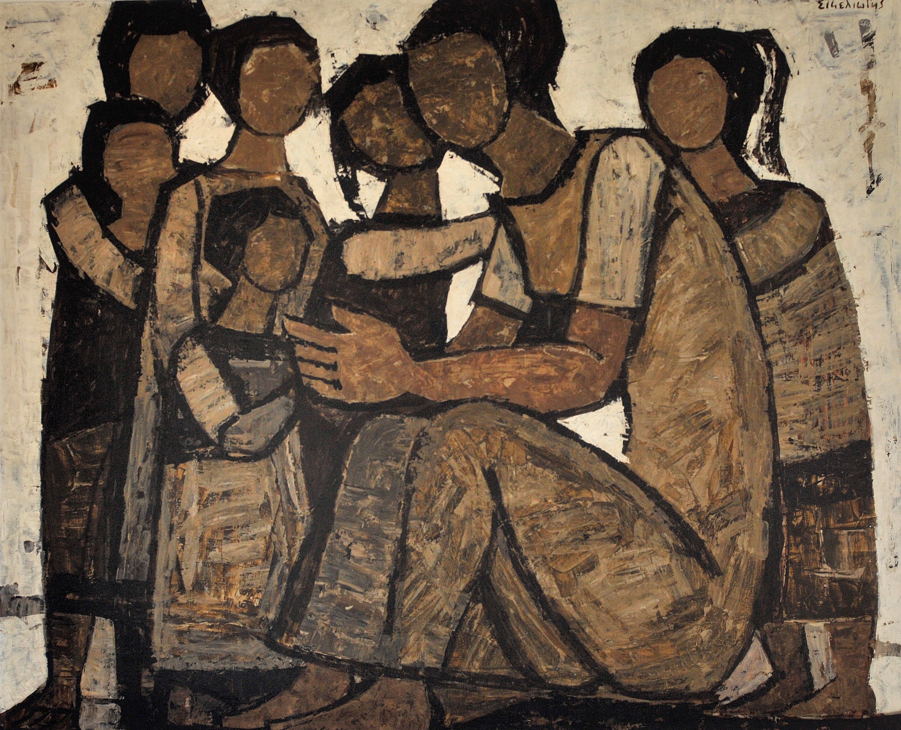 The painting Dialogue is an abstract composition, part of Yiannis Moralis’ later works. It reflects the artist’s evolution from realistic to abstractive representation. The painting is a typical sample of Moralis’ personal idiom, which deconstructs human forms, turning them into shapes. Yiannis Moralis had a decisive impact on modern-Greek art through his work and teaching.