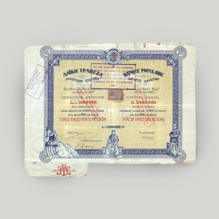 The modernisation of Credit Bank began in 1972. The bank created a new corporate identity and started to benefit from the loosening of the restrictions governing the Greek banking system until then. By the end of the 1980s, its group of undertakings covered almost the entirety of products and services in the financial sector. The Credit Bank 1-share stock certificate from 1982 belongs to the Alpha Bank debt securities and shares collection covering the years from 1972 to 1993.